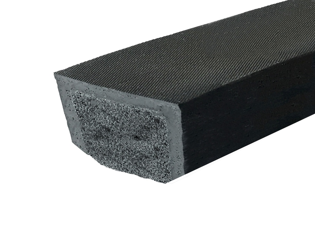 This seal is comprised of a solid outer natural rubber on three sides with a cellular expanded natural rubber sponge core bonded to the solid rubber faces. The solid outer rubber strengthens the seal whilst the internal cellular sponge offers great recovery from compression and creates a water tight seal. The two bottom corners are chamfered to enable the seal to securely fit into the channel allowing for welds in the channel itself.